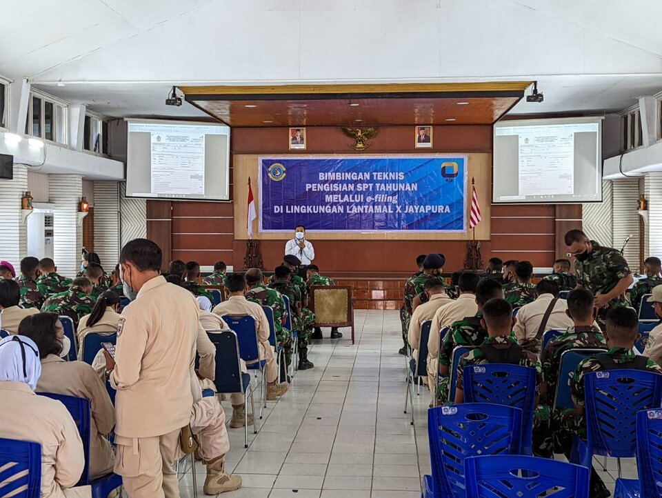 Kantor Pelayanan Pajak (KPP) Pratama Jayapura menyelenggarakan bimbingan teknis (bimtek) pelaporan SPT Tahunan PPh Orang Pribadi secara e-Filing di Aula Samudera Loka Lantamal X Jayapura, Jalan Kelapa Dua, Kota Jayapura, Papua (Senin, 7/3). Kegiatan ini dilaksanakan untuk memenuhi undangan dari Kepala Akuntasi Lantamal X Jayapura Mayor Indra Dwi Cahyanto.