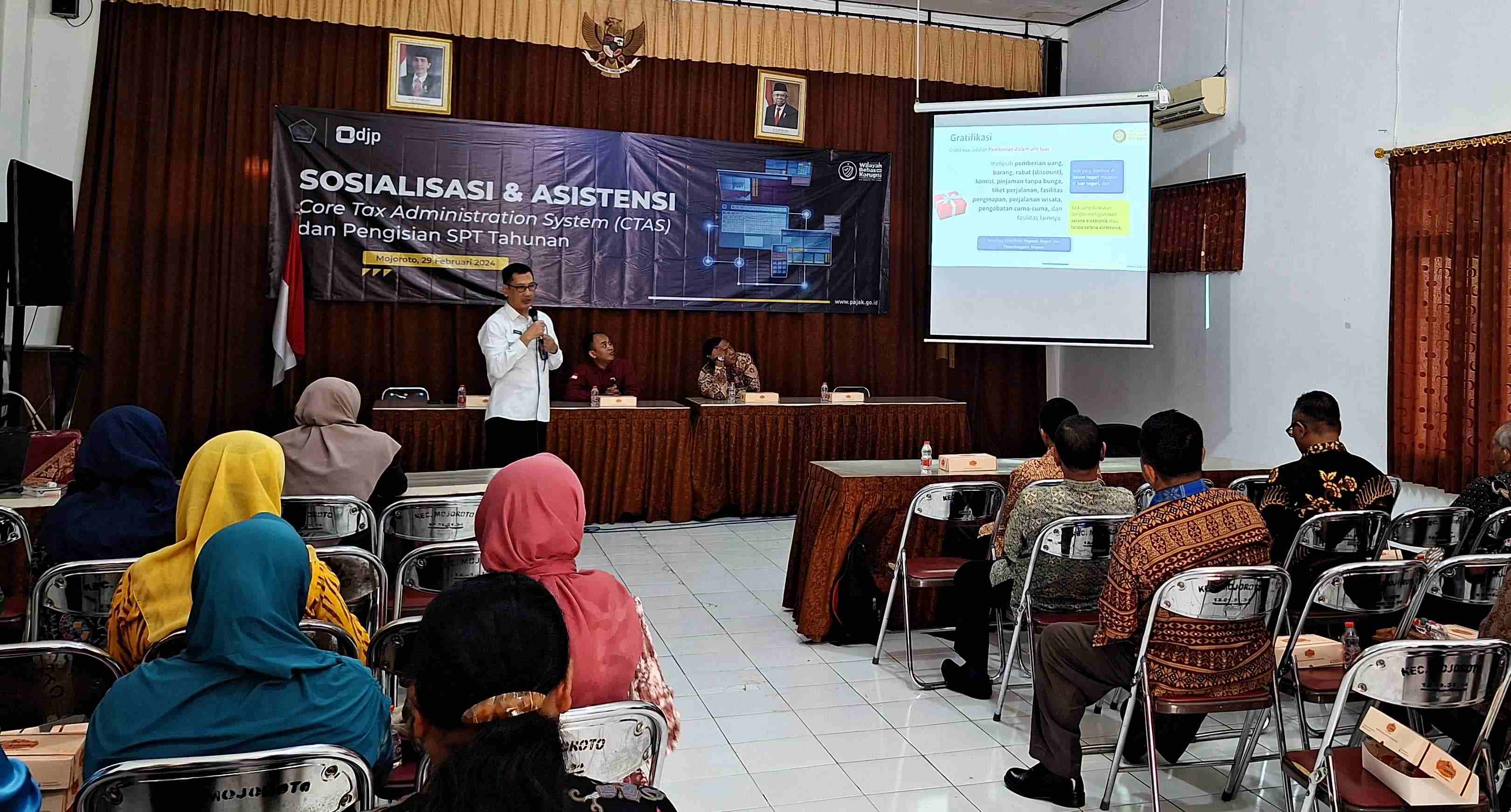 Selain pemberian asistensi pelaporan SPT Tahunan, tim penyuluh KPP Pratama Kediri juga memberikan sosialisasi terkait CTAS (Core Tax Administration System) proses bisnis registrasi. Menurut Kepala KPP Pratama Kediri, Mulyanto Budi Santosa, CTAS akan memudahkan wajib pajak. "Nah ini ada aplikasi baru, namanya CTAS atau coretax yang pastinya jauh lebih memudahkan. Pada penerapan CTAS terdapat saluran baru layanan administrasi perpajakan yaitu 3C (Click, Call, Counter). Proses Click dilakukan melalui laman pajak.go.id. Proses Call dilakukan dengan menghubungi Kring Pajak 1500 200. Sedangkan, proses Counter dilakukan dengan datang langsung ke loket KPP/KP2KP," jelas Mulyanto.