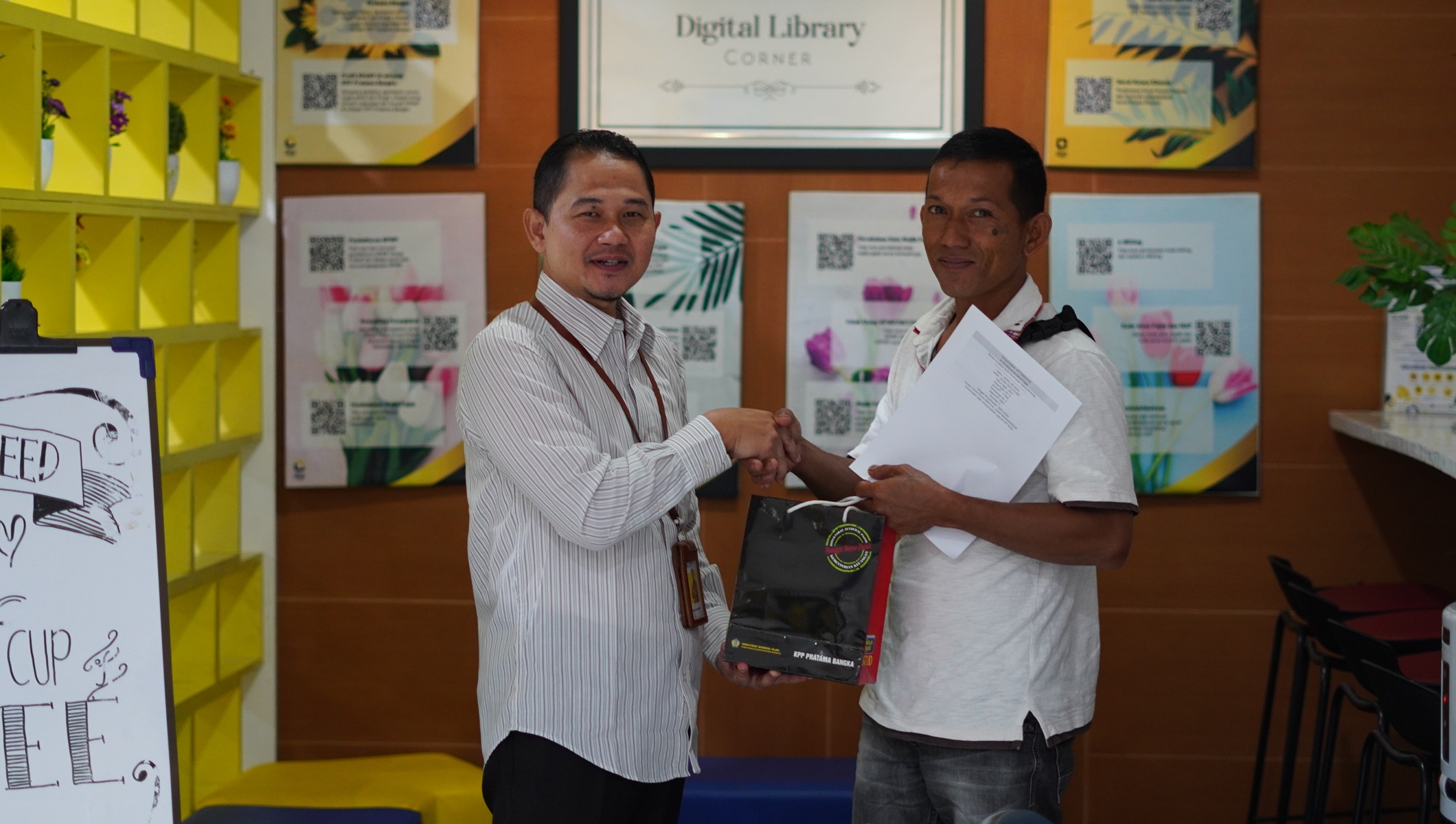 “Terima kasih Pak sudah melaukan pelaporan pajak lebih awal,” ungkap Kasi Pelayanan Kantor Pelayanan Pajak Pratama (KPP) Bangka saat memberikan suvenir kepada salah satu wajib pajak Usaha Mikro Kecil dan Menengah (UMKM) di Tempat Pelayanan Terpadu (TPT) KPP Pratama Bangka (Selasa, 2/1).