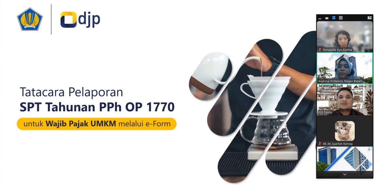 Kantor Pelayanan Pajak (KPP) Pratama Batam Selatan menyelenggarakan Business Development Services (BDS) kepada Relawan Pajak dari Tax Center Politeknik Negeri Batam (Polibatam) secara daring di Kota Batam, Kepulauan Riau (Jumat, 28/6). BDS adalah program Direktorat Jenderal Pajak (DJP) dalam memberikan pelatihan dan bimbingan perpajakan dalam program pembinaan Usaha Mikro, Kecil, dan Menengah (UMKM).