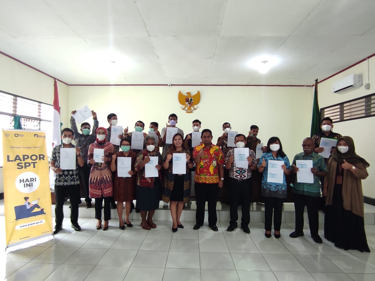Dalam kesempatan ini, KP2KP Kaimana menugaskan tiga orang pegawainya untuk melaksanakan asistensi pelaporan SPT Tahunan PPh Orang Pribadi Tahun Pajak 2021 secara e-Filing. Pegawai Pengadilan Negeri Kaimana yang hadir dalam kegiatan asistensi SPT ini berjumlah sekitar 28 orang. Acara berjalan dengan lancar dan tertib hingga semua peserta yang hadir telah melaporkan SPT Tahunan PPhnya secara e-Filing dan memperoleh Bukti Penerimaan Elektronik (BPE) melalui email masing-masing pegawai. Acara ditutup dengan foto bersama para peserta kegiatan dengan tim dari KP2KP Kaimana.
