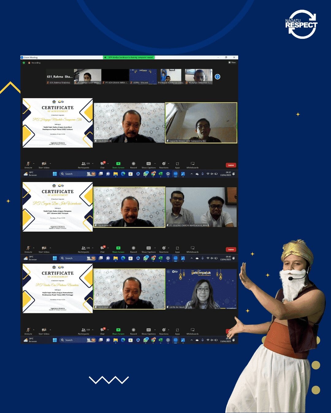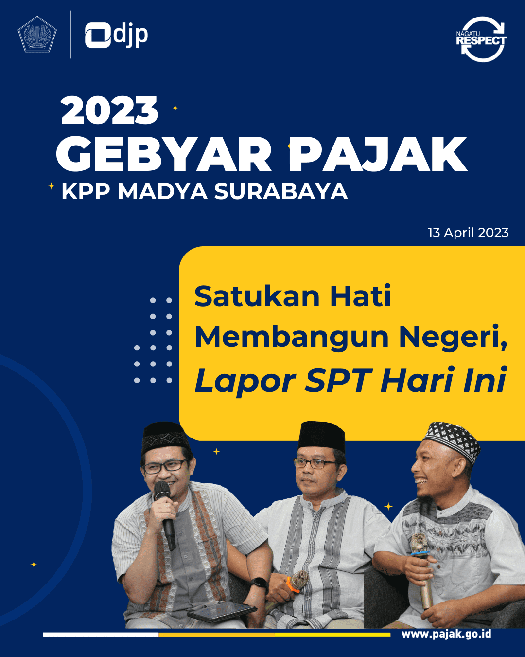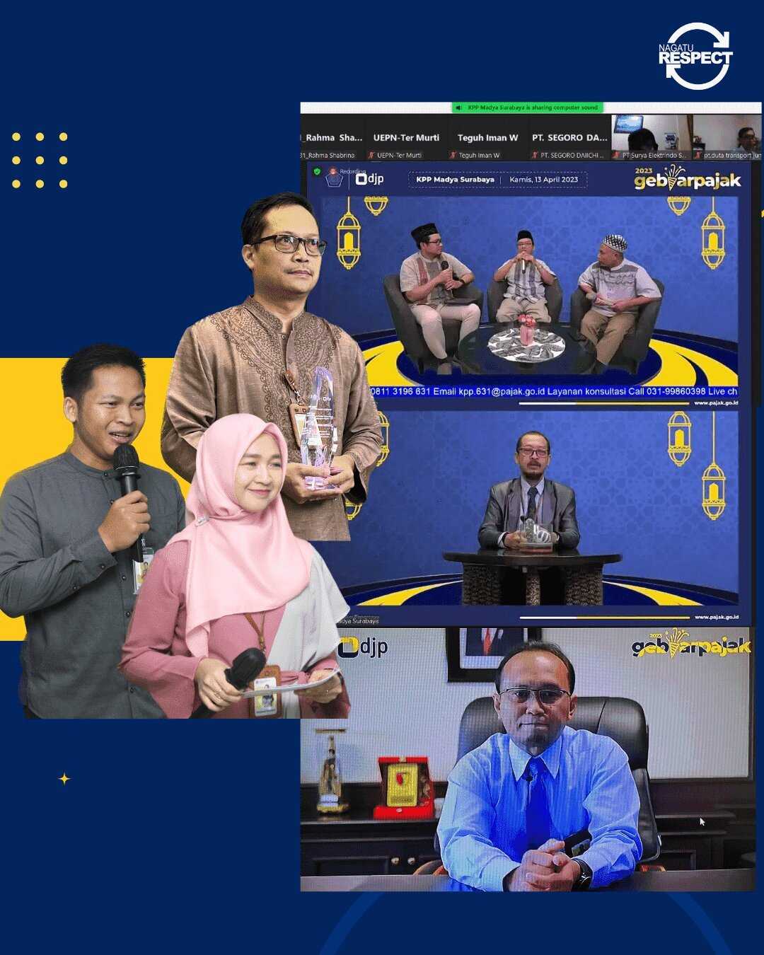 Kantor Pelayanan Pajak (KPP) Madya Surabaya menyelenggarakan Gebyar Pajak Tahun 2023 secara virtual dengan mengusung tema "Satukan Hati Membangun Negeri, Lapor SPT Hari Ini". Gebyar Pajak Tahun 2023 merupakan sarana pemberian penghargaan sebagai apresiasi kepada wajib pajak yang telah berkontribusi untuk penerimaan perpajakan tahun pajak 2022 (Kamis, 13/4).