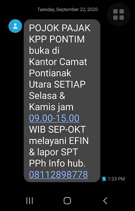 SMS Blast dikirimkan kepada 4.000 wajib pajak orang pribadi yang terdaftar di KPP Pratama Pontianak Timur, khususnya yang beralamat di Kecamatan Pontianak Utara. Wajib pajak diimbau untuk segera melaporkan SPT Tahunan 2019. Selain itu dalam pesan SMS terdapat juga informasi Pojok Pajak yang dibuka di Kantor Kecamatan Pontianak Utara.