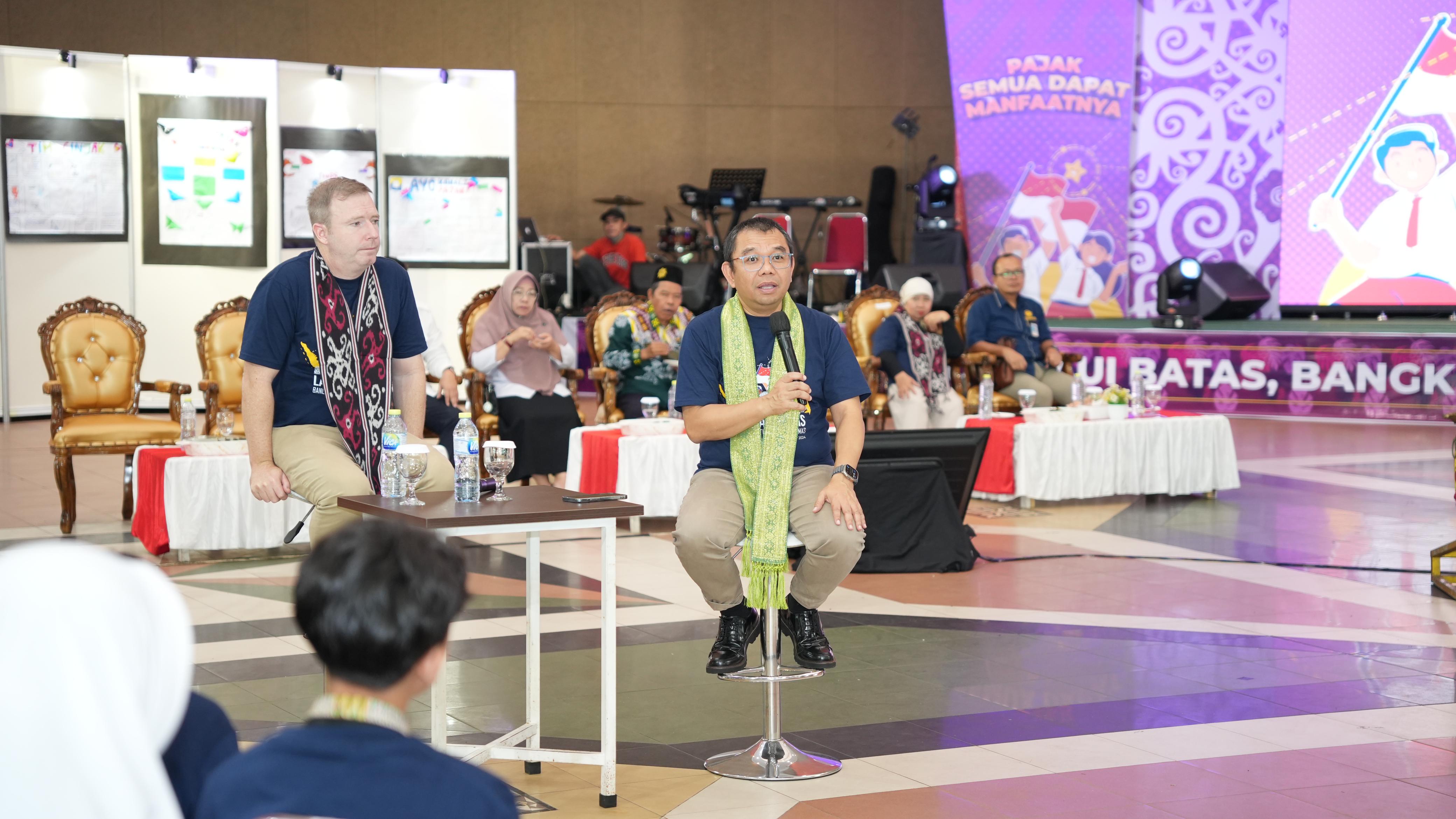 Puncak acara Pajak Bertutur tahun 2024 di Kota Pontianak ini diisi juga dengan sesi dialog antara para pelajar bersama Staf Ahli Menteri Keuangan Bidang Kepatuhan Pajak Yon Arsal dan Senior Advisor Prospera Australian Taxation Office (ATO) Grant Leader.