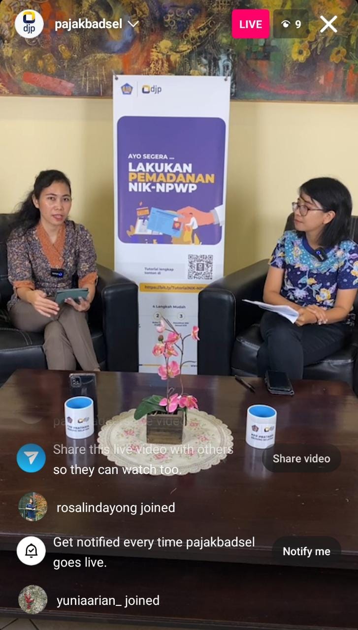Kantor Pelayanan Pajak (KPP) Pratama Badung Selatan mengadakan edukasi dengan tema Pelaporan Surat Pemberitahuan (SPT) Tahunan Orang Pribadi serta Pemadanan Nomor Induk Kependudukan (NIK) sebagai Nomor Pokok Wajib Pajak (NPWP) melalui Instagram Live @pajakbadsel di KPP Pratama Badung Selatan. Edukasi perpajakan disampaikan oleh Penyuluh Pajak KPP Pratama Badung Selatan Putu Eka Rini Larashati sebagai pemateri dan Sherley Diana Thandung sebagai moderator (Jumat, 17/3).