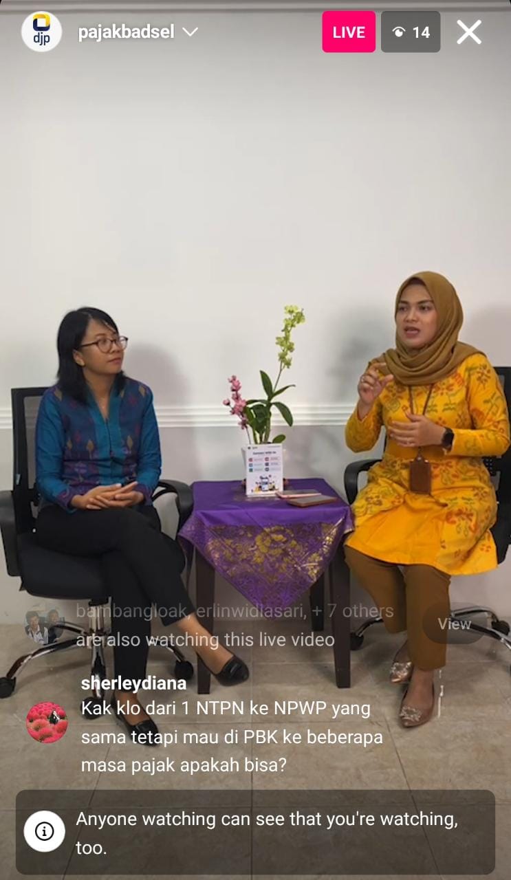 Para peserta juga diberikan kesempatan untuk bertanya dan mendapatkan jawaban langsung dari tim penyuluh pajak. Pada akhir acara, Suzanne juga mengucapkan terima kasih kepada Wajib Pajak yang telah mengikuti kegiatan kelas pajak secara daring melalui siaran langsung instagram dan apabila terdapat pertanyaan lebih lanjut Wajib Pajak dapat bertanya ke KPP melalui helpdesk atau whatsapp live chat.