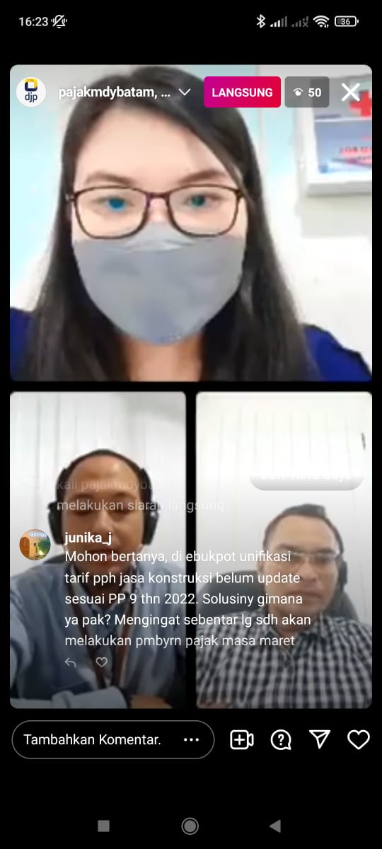 Kantor Pelayanan Pajak (KPP) Madya Batam kembali mengadakan siaran langsung (Live) Instagram tentang Surat Pemberitahuan (SPT) Masa Pajak Penghasilan (PPh) Unifikasi di Batam, Kepulauan Riau (Kamis, 31/3).