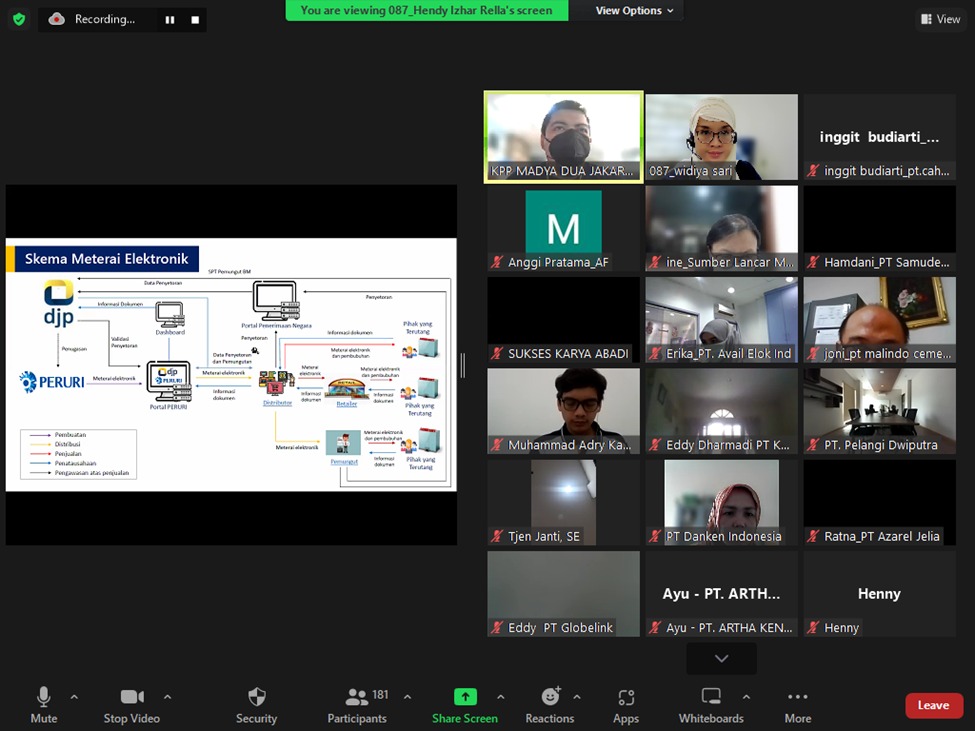 Kantor Pelayanan Pajak (KPP) Madya Dua Jakarta Barat mengadakan kegiatan sosialisasi bea meterai dengan mengundang seluruh wajib pajak (WP) yang terdaftar pada KPP Madya Dua Jakarta Barat. Kegiatan sosialisasi ini dilakukan secara daring melalui aplikasi Zoom Meeting (Kamis, 8/12).