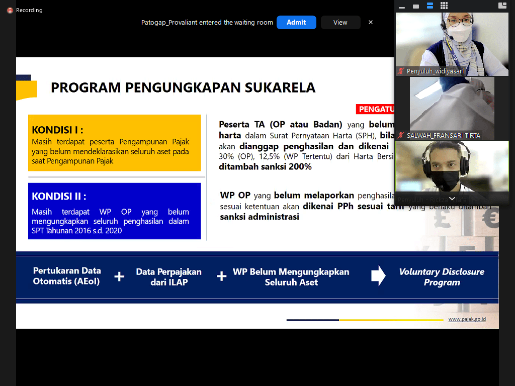 Kantor Pelayanan Pajak (KPP) Madya Dua Jakarta Barat menggelar sosialisasi Program Pengungkapan Sukarela (PPS) secara daring melalui Aplikasi Zoom Meeting dari KPP Madya Dua Jakarta Barat (Rabu, 9/3). Sebelumnya, KPP Madya Dua Jakarta Barat telah mengirimkan undangan melalui surel kepada 1.115 Wajib Pajak terdaftar.