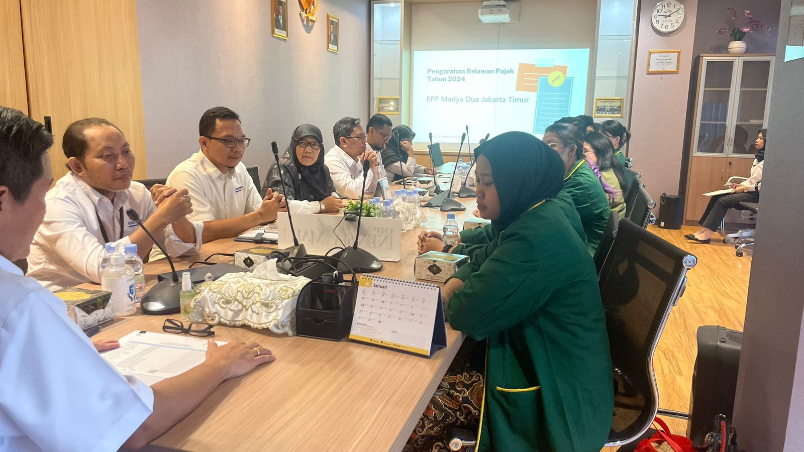 Sebanyak sepuluh relawan pajak dari Tax Center Kalbis Institute mengikuti pembekalan terkait perpajakan, khususnya Pelaporan SPT Tahunan Orang Pribadi di Ruang Rapat Darmin Nasution, KPP Madya Dua Jakarta Timur (Senin, 12/2). Relawan Pajak ini merupakan sekelompok mahasiswa yang diturunkan langsung untuk melakukan asistensi kepada wajib pajak terkait dengan Pelaporan SPT Tahunan PPh Orang Pribadi dan Pemadanan (NIK) menjadi (NPWP).