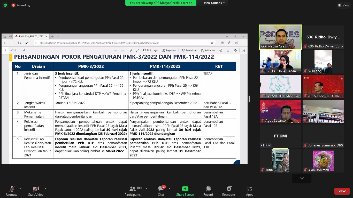 Kantor Pelayanan Pajak (KPP) Madya Gresik mengadakan Kelas Pajak Online: Pemberlakuan 3 Peraturan Menteri Keuangan (PMK) Baru di Gresik (Selasa, 30/8). Kelas pajak dihadiri oleh wajib pajak KPP Madya Gresik yang telah diundang sebelumnya.