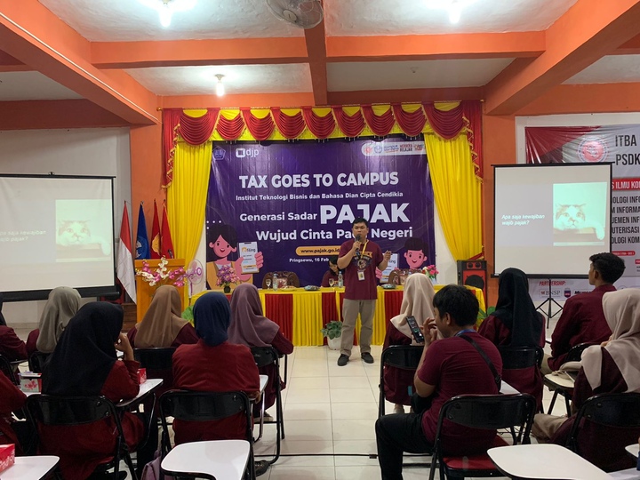 Kantor Pelayanan, Penyuluhan, dan Konsultasi Perpajakan (KP2KP) Pringsewu bersama dengan Pejabat Fungsional Kantor Pelayanan Pajak (KPP) Pratama Natar Andika Windianto, Candra Irawan dan Riris Citra Utari, melaksanakan kegiatan Tax Goes To Campus (TGTC) di Institut Teknologi Bisnis dan Bahasa (ITBA) Dian Cipta Cendikia (DCC) Pringsewu, Kab. Pringsewu (Kamis, 16/02). Kegiatan ini diikuti oleh 100 orang mahasiswa dan pelajar di wilayah Kabupaten Pringsewu.