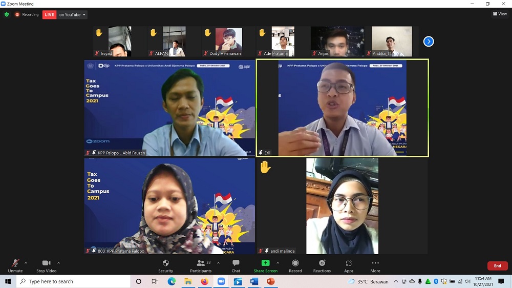 Kantor Pelayanan Pajak Pratama Palopo bekerja sama dengan Universitas Andi Djemma Kota Palopo menyelenggarakan kegiatan Tax Goes To Campus secara daring dengan Tema “Milenial Bijak Taat Pajak” di Palopo, Sulawesi Selatan (Rabu, 27/10).