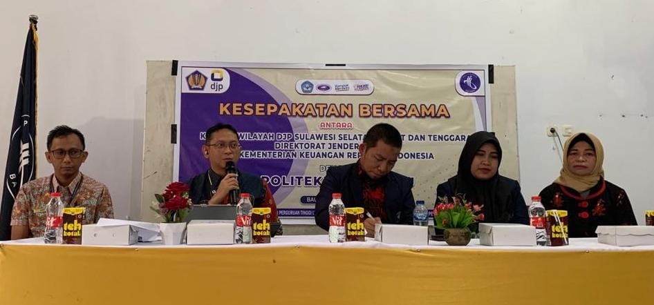 Kantor Wilayah Direktroat Jenderal Pajak Sulawesi Selatan, Barat, dan Tenggara (Kanwil DJP Sulselbartra), diwakili oleh Kantor Pelayanan Pajak (KPP) Pratama Baubau, menghadiri kegiatan penandatanganan MoU Tax Center Politeknik Baubau, Kota Bau-Bau, Sulawesi Tenggara (Jumat, 4/8). Direktur Politeknik Baubau Asriadi menerima kedatangan Kepala KPP Pratama Baubau Tangguh Dewantara berserta tim dengan baik.