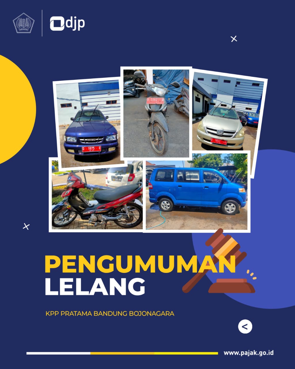 Kantor Pelayanan Pajak (KPP) Pratama Bandung Bojonagara mengumumkan pelaksanaan lelang Barang Milik Negara (BMN) berupa tiga kendaraan roda empat dan tiga kendaraan roda dua melalui akun media sosial instagram @pajakbojonagara, Kota Bandung (Kamis,12/10).