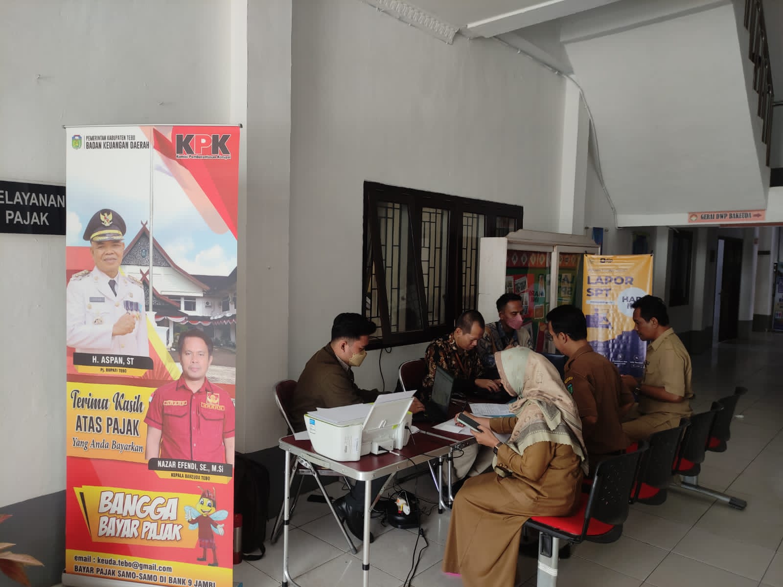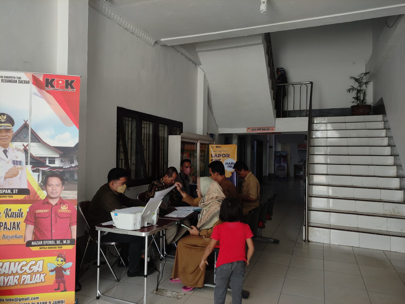 Kantor Pelayanan, Penyuluhan, dan Konsultasi Perpajakan (KP2KP) Muara Tebo mengadakan pojok pajak untuk melayani pelaporan Surat Pemberitahuan (SPT) Tahunan Orang Pribadi dan Pemutakhiran Data Mandiri Nomor Induk Kependudukan (NIK)-Nomor Pokok Wajib Pajak (NPWP) bagi pegawai di lingkungan Pemerintah Kabupaten Tebo di Komplek Perkantoran Kabupaten Tebo tepatnya di Kantor Badan Keuangan Daerah Kabupaten Tebo, Kab. Tebo (Selasa, 28/02).
