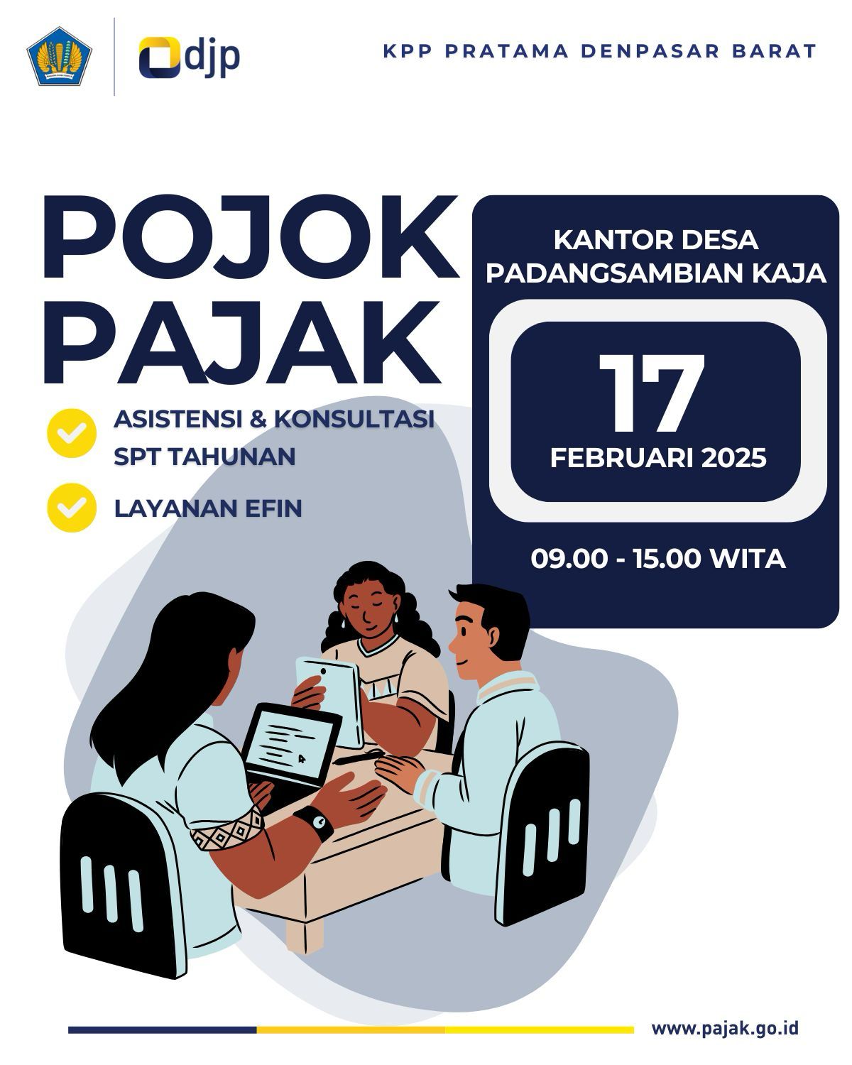 "KPP Pratama Denpasar Barat membuka layanan pojok pajak di kantor kelurahan dan desa di wilayah kerja kami secara bergantian dari awal bulan Februari sampai dengan akhir Maret 2025. Kami secara berkala akan menginformasikan waktu dan lokasi pojok pajak melalui medsos di akun resmi kami," ungkapnya.