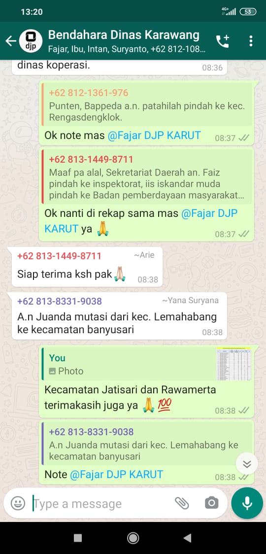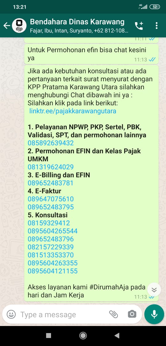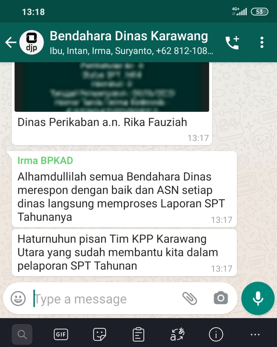 KPP Karawang Utara mengimbau ASN Pemerintah Daerah untuk lapor SPT Tahunan melalui media grup WhatsApp (Jumat, 5/6). Grup WhatsApp Bendahara ini beranggota 61 Bendahara terdiri dari 31 Bendahara Dinas dan 30 Bendahara Kecamatan Kabupaten Karawang. Administrator grup ini ialah Hari Surjono selaku Kepala Seksi Ekstensifikasi dan Penyuluhan, serta dibantu lima pegawai Tim Penyuluh KPP yang siap membantu wajib pajak.