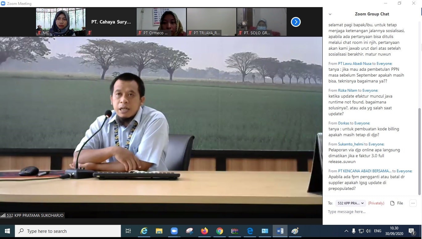 Kantor Pelayanan Pajak (KPP) Pratama Sukoharjo kembali menyelenggarakan sosialisasi aplikasi e-Faktur 3.0 melalui media telekonferensi di ruang rapat KPP Pratama Sukoharjo (Rabu, 30/9). Sosialisasi kali ini diikuti oleh 59 Pengusaha Kena Pajak (PKP) yang terdaftar di KPP Pratama Sukoharjo.