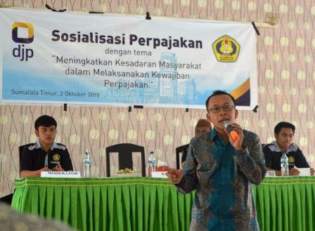Kantor Pelayanan Penyuluhan dan Konsultasi Perpajakan (KP2KP) Limboto kembali melakukan kegian sosialisasi perpajakan di aula Desa Dulukapa Kecamatan Sumalata Timur Kabupaten Gorontalo Utara (Rabu, 2/10). Kali ini KP2KP Limboto bekerja sama dengan Mahasiswa Universitas Gorontalo yang sedang melaksanakan kegiatan Kuliah Kerja Praktik di Desa Dulukapa. Kegiatan bertajuk “Meningkatkan Kesadaran Masyarakat dalam Melaksanakan Kewajiban Perpajakan” tersebut dihadiri oleh Camat Sumalata Timur Ibrahim Ismail, perangkat desa se-Kecamatan Sumalata Timur, tokoh masyarakat Desa Dulukapa, dan pelaku Usaha Mikro Kecil Menengah (UMKM).