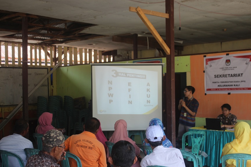 Kantor Peayanan, Penyuluhan, dan Konsultasi Perpajakan (KP2KP) Buol melakukan kunjungan ke Kantor Kelurahan Kali, Biau, Buol, Sulawesi Tengah (Jumat, 12/5). Aksi ini dalam rangka pemberian asistensi dan penyuluhan terkait Pelaporan SPT Tahunan serta imbauan Pemadanan NIK-NPWP bagi wajib pajak di wilayah Kelurahan Kali. Turut hadir pula dalam kegiatan ini Kepala KP2KP Buol Sofyan Wahyudi, Lurah Kali, serta Aparatur Kelurahan Kali.