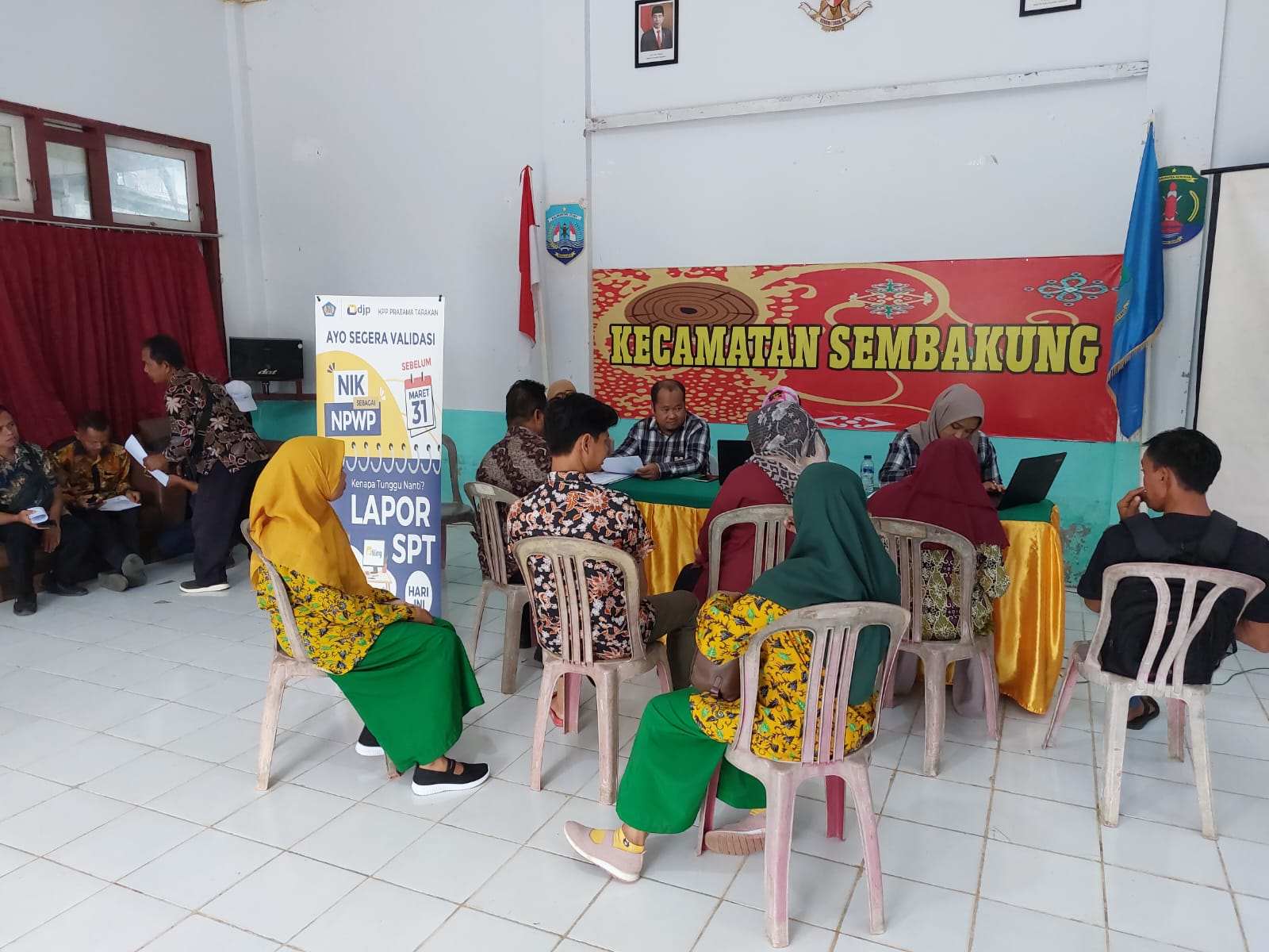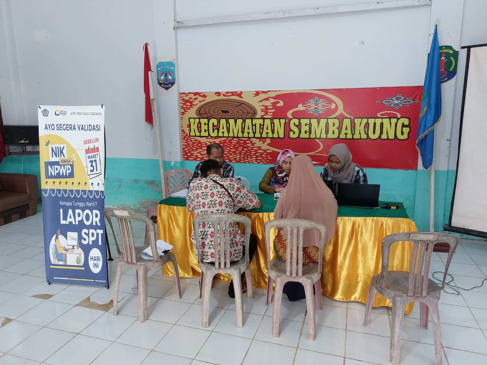 Tim Kantor Pelayanan Pajak (KPP) Pratama Tarakan yang dipimpin oleh Irawan Sastra Ariwijaya melakukan kunjungan ke Kantor Kecamatan Sembakung dalam rangka asistensi pelaporan Surat Pemberitahuan (SPT) Tahunan sekaligus pemutakhiran data mandiri atau sering kita sebut pemadanan NIK menjadi NPWP di Kabupaten Nunukan (Jumat, 31/03).