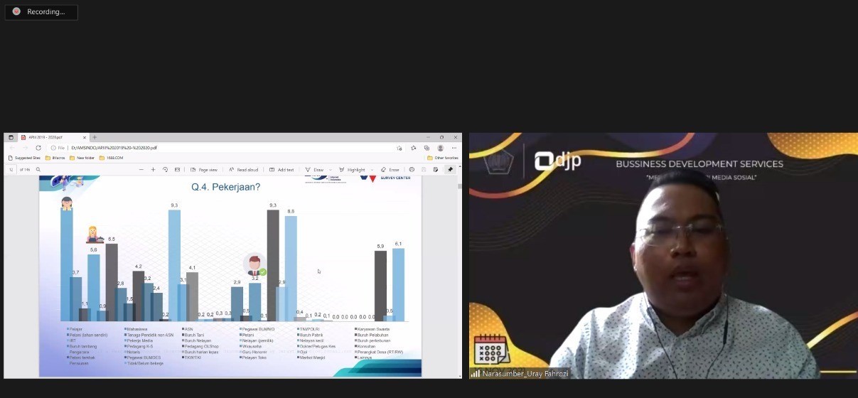 Kantor Wilayah Direktorat Jenderal Pajak (Kanwil DJP) Kalimantan Barat beserta Kantor Pelayanan Pajak (KPP) Pratama, dan Kantor Pelayanan, Penyuluhan, dan Konsultasi Perpajakan (KP2KP) mengadakan kegiatan Business Development Servicess (BDS). Dengan tema “Meraup Cuan dari media Sosial” kegiatan diadakan secara daring di Pontianak (Selasa, 16/11). Bekerja sama dengan Digital Entrepreneur, Kanwil DJP Kalimantan Barat menghadirkan Uray Tiar Fahrozi yang merupakan Pendiri dari Pontianak Informasi.