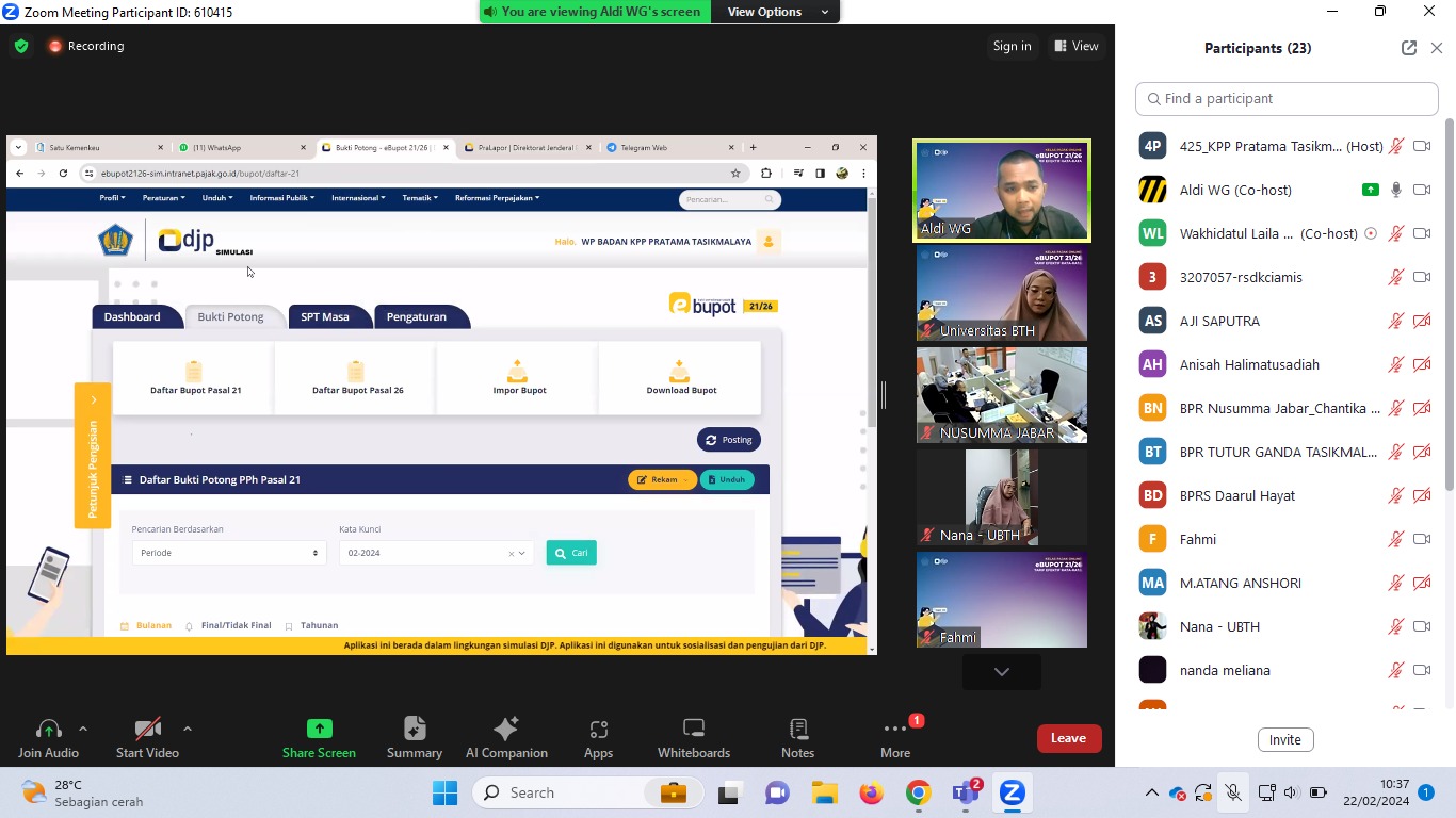 Kantor Pelayanan Pajak (KPP) Pratama Tasikmalaya memberikan sosialisasi Pajak Penghasilan (PPh) Pasal 21 dalam kegiatan kelas pajak kepada 23 wajib pajak KPP Pratama Tasikmalaya secara daring melalui aplikasi Zoom Meeting (Selasa, 20/2).
