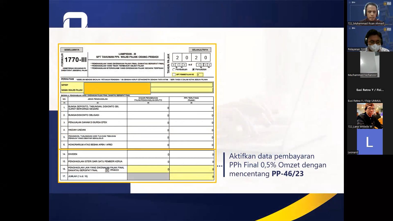 Acara yang dipandu dari Gedung KPP Pratama Samarinda Ilir melalui Aplikasi Zoom Meeting ini diikuti oleh 28 peserta yang merupakan pelaku Usaha Mikro, Kecil, dan Menengah (UMKM). Dimoderatori oleh pelaksana KPP Pratama Samarinda Ilir Muhammad Ismail, kelas pajak ini diisi oleh Penyuluh Pajak Muhammad Ihsan Ahmad sebagai pemateri.