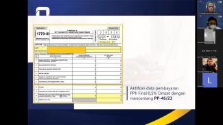Materi yang disampaikan meliputi hak dan kewajiban perpajakan yang dimiliki oleh wajib pajak, tata cara menghitung dan membayar Pajak Penghasilan (PPh) Final Pasal 4 ayat (2) sesuai Peraturan Pemerintah Nomor 23 Tahun 2018 (PP 23/2018), sosialisasi batas peredaran bruto tidak dikenai pajak bagi Wajib Pajak Orang Pribadi yang menghitung PPh dengan tarif final 0,5% (PP 23/2018) sesuai Undang-Undang Harmonisasi Peraturan Perpajakan, dan tata cara pengisian SPT Tahunan 1770 melalui e-Form.