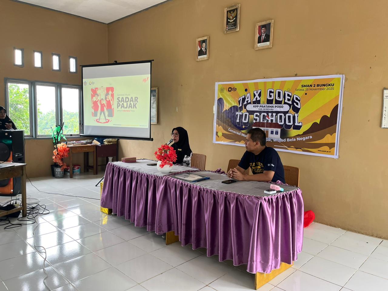 Kantor Pelayanan Pajak (KPP) Pratama Poso telah melaksanakan kegiatan Tax Goes To School (TGTS)di SMAN 2 Bungku (Selasa, 25/11). Program ini bertujuan mengenalkan pentingnya peran pajak sejak dini kepada para siswa. Kegiatan diikuti oleh 30 siswa dan 8 tenaga pengajar.