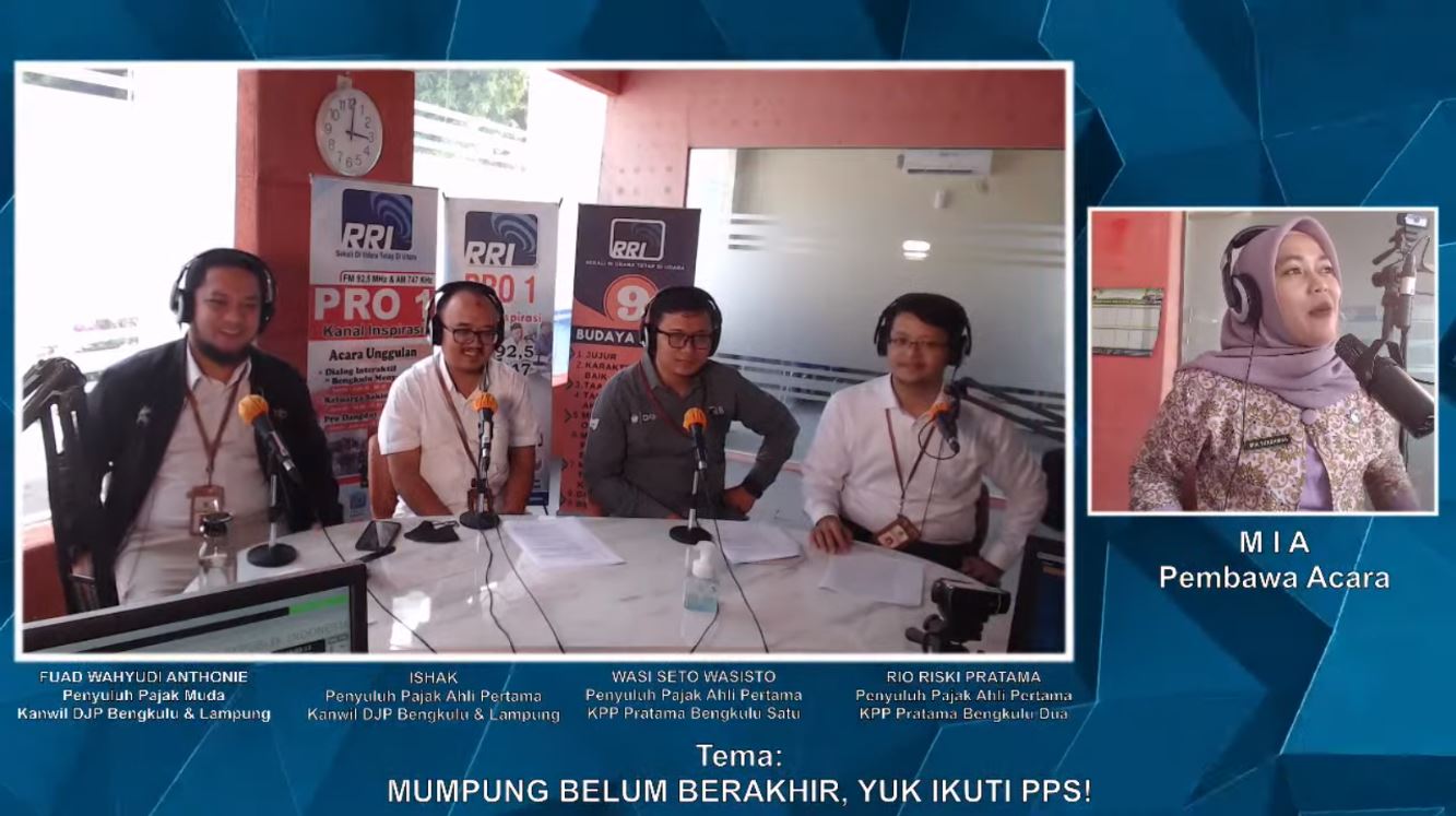 Tema yang diusung dalam siaran tersebut adalah “Mumpung Belum Berakhir, Yuk Ikuti PPS”. Siaran dalam bentuk gelar wicara tersebut dimulai pukul 15.00 s.d. 16.00 WIB dengan empat orang narasumber dari Fungsional Penyuluh KPP Pratama Bengkulu Satu, KPP Pratama Bengkulu Dua, dan Kanwil DJP Bengkulu dan Lampung.
