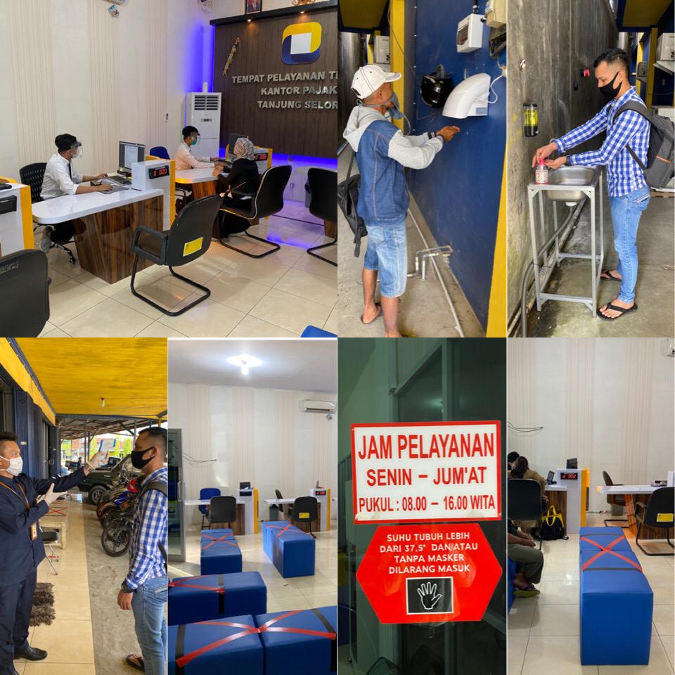 Dalam rangka pencegahan Covid-19, layanan perpajakan secara tatap muka dilaksanakan sesuai protokol kesehatan yang diinstruksikan oleh pemerintah. Jauh hari sebelum beroperasi kembali, KPP Mikro Tanjung Selor telah mempersiapkan sarana dan prasarana penunjangnya. Antara lain penyiapan hand sanitizer, face shield, thermogun, hand dryer wastafel, dan sebagainya.