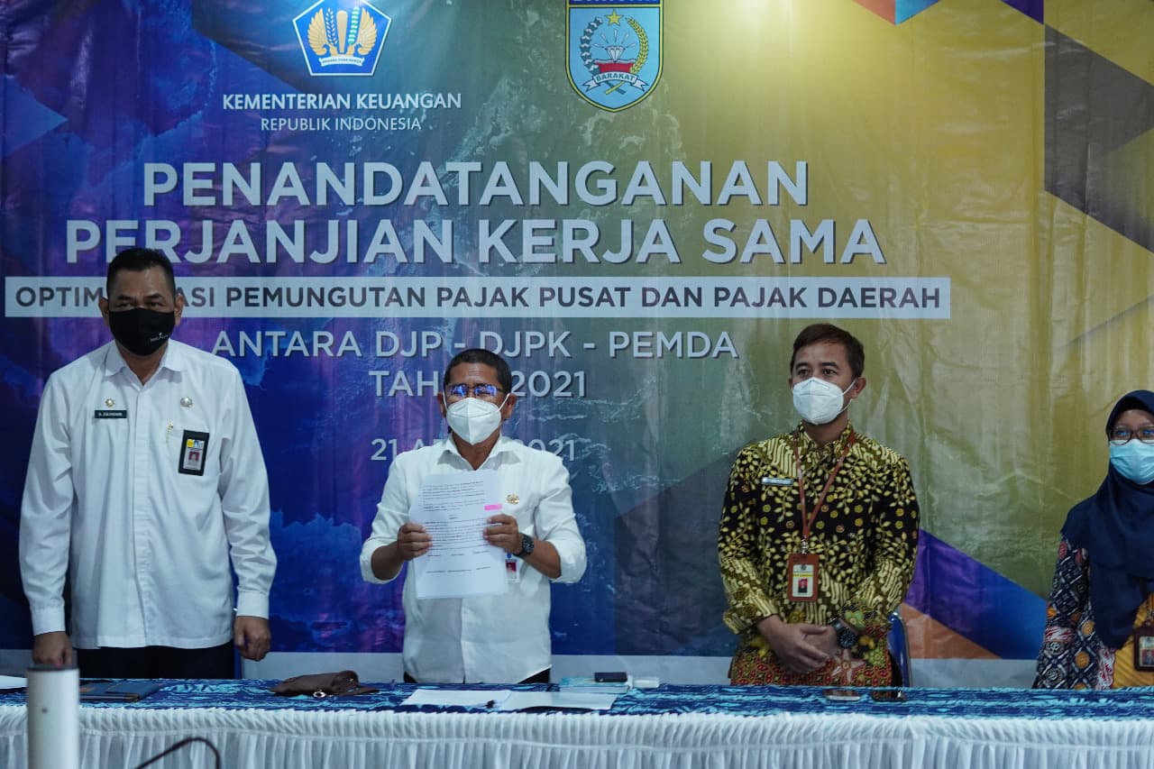 Pemerintah Daerah (Pemda) Kabupaten Banjar menandatangani Perjanjian Kerja Sama (PKS) antara Pemerintah Daerah Kabupaten Banjar, Direktorat Jenderal Pajak (DJP), dan Direktorat Jenderal Perimbangan Keuangan (DJPK), di Kantor Badan Pendapatan Daerah (BAPENDA) Kabupaten Banjar, Banjar, Kalimantan Selatan (Rabu, 21/4).