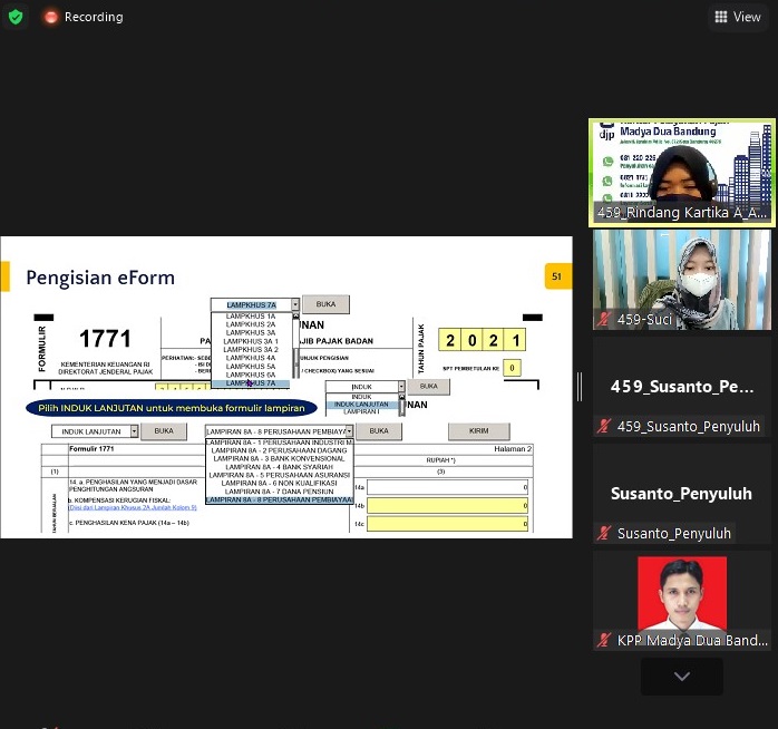 Sebagai upaya mengejar 100% tingkat kepatuhan pelaporan Surat Pemberitahuan (SPT) Tahunan Pajak Penghasilan (PPh) Badan Tahun Pajak 2021. Tim Fungsional Penyuluh Kantor Pelayanan Pajak (KPP) Madya Dua Bandung mengundang wajib pajak mengikuti Kelas Pajak secara daring melalui aplikasi Zoom Meeting di Jalan Ibrahim Adjie No.372, Kota Bandung (Rabu, 6/7).