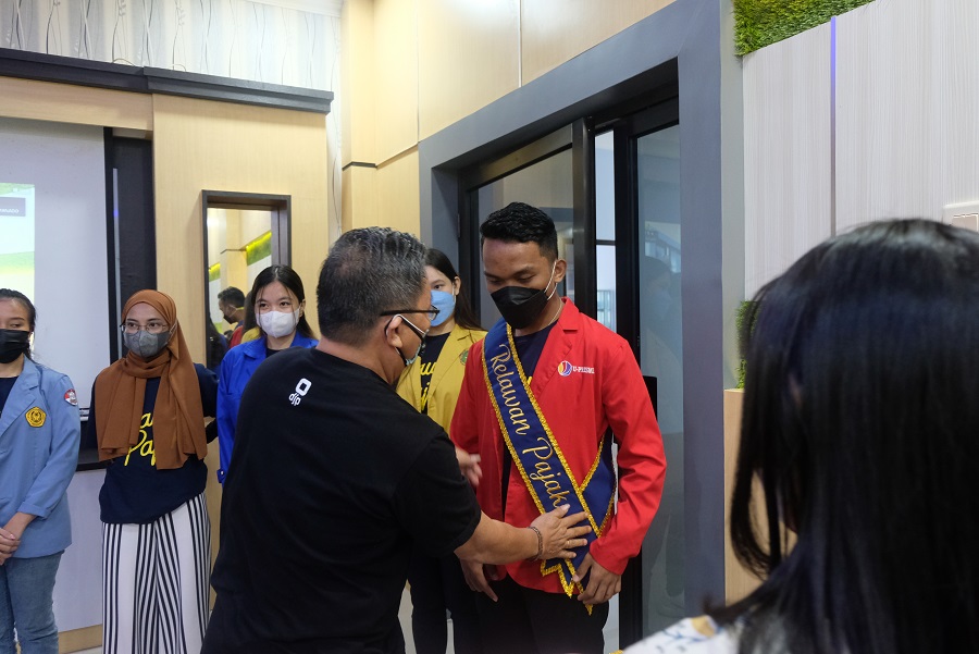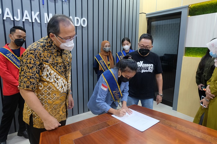 Pengukuhan ditandai dengan penyematan selempang Relawan Pajak oleh Kepala KPP Pratama Manado yang diwakilkan oleh Kepala Seksi Pengawasan V Anes Audie Ever Maleke dan penandatanganan Code of Conduct Relawan Pajak.