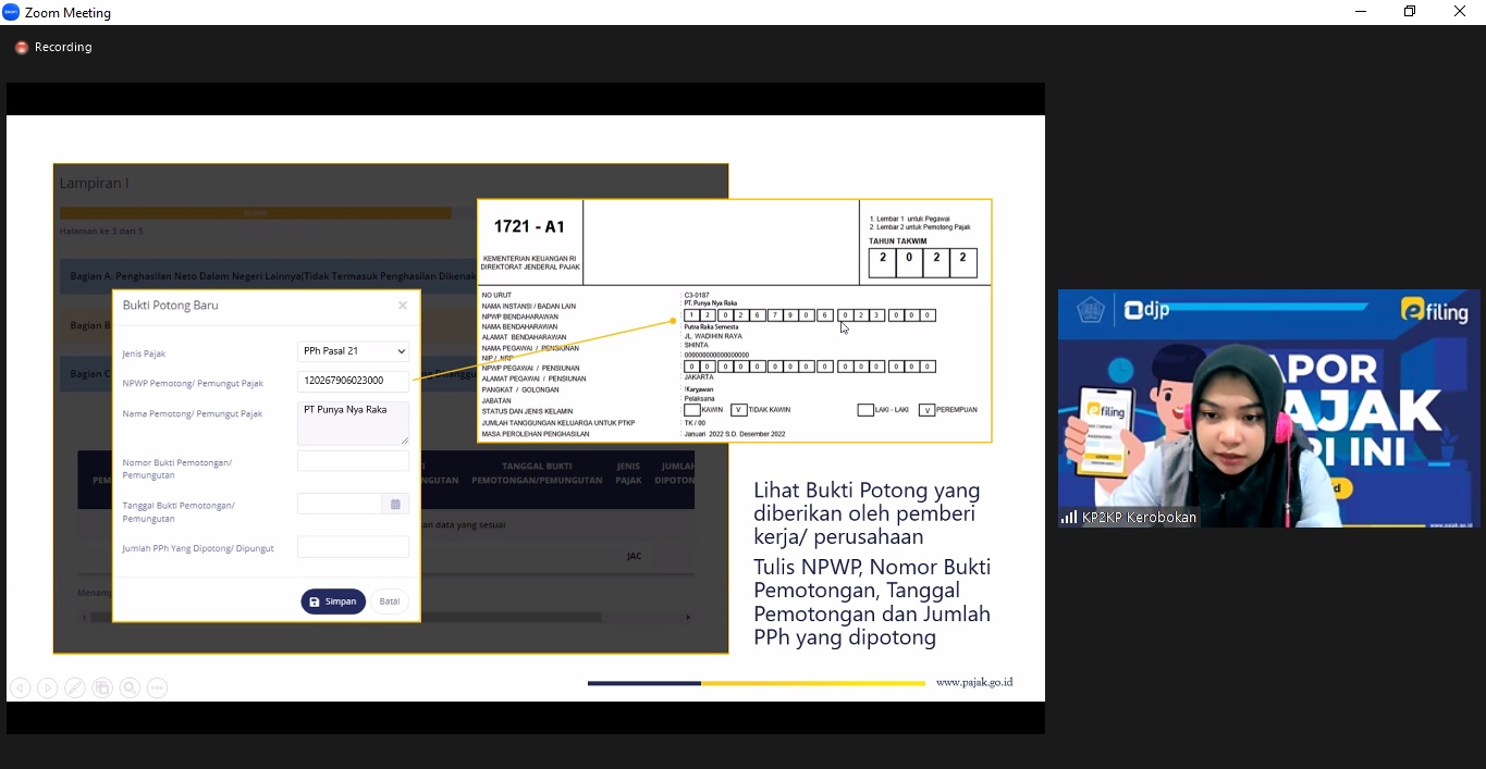 Tujuan pelaksanaan penyuluhan ini adalah untuk mengimbau wajib pajak yang belum melaporkan SPT Tahunan 2022 serta memberikan simulasi tata cara pelaporan SPT Tahunan secara daring melalui e-Filling. Dalam penyuluhan ini, Dviranda Wahyudi selaku pemateri juga mengingatkan wajib pajak untuk melakukan pemadanan Nomor Induk Kependudukan (NIK) dengan Nomor Pokok Wajib Pajak (NPWP). Vira menyampaikan bahwa Pemadanan NIK-NPWP tersebut dapat dilakukan secara daring pada laman pajak.go.id.