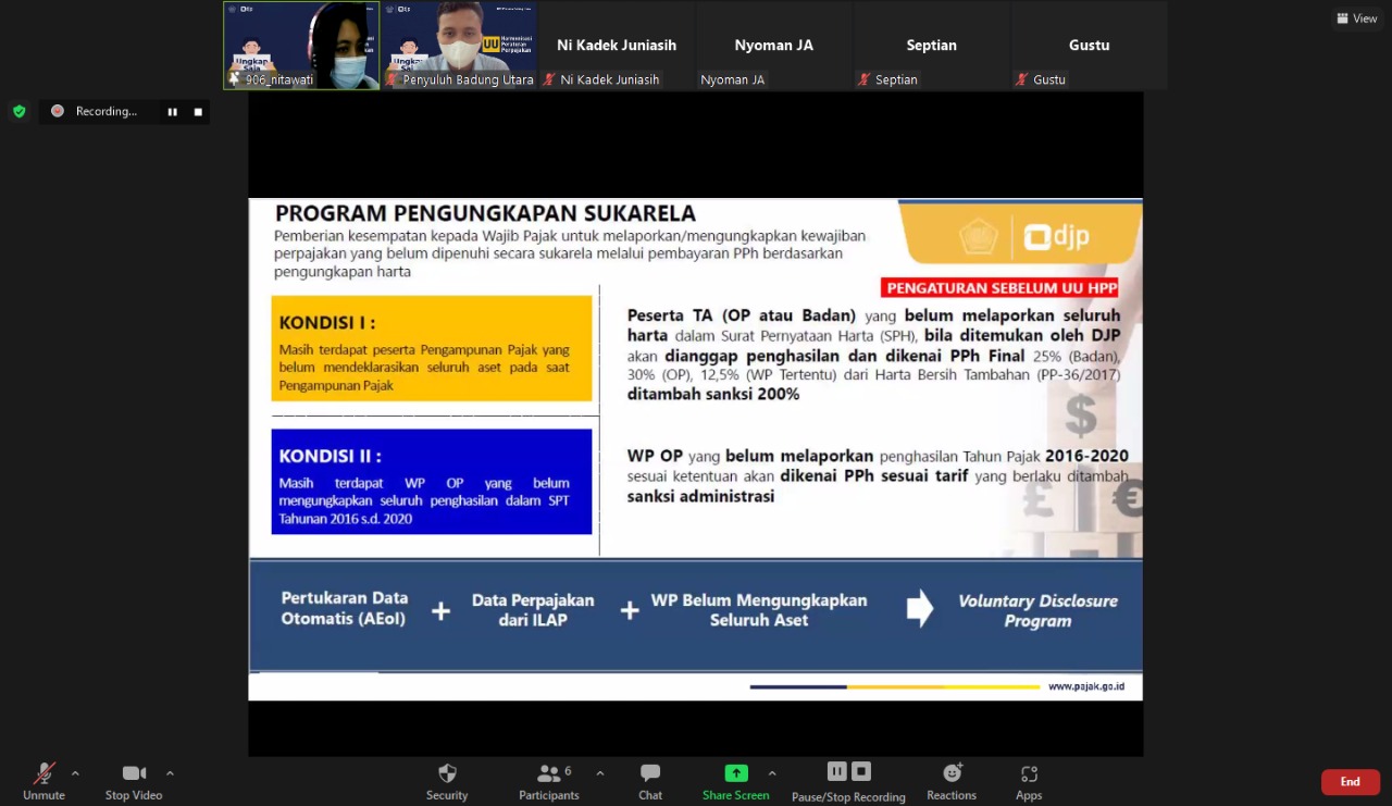 Kantor Pelayanan Pajak (KPP) Pratama Badung Utara melaksanakan kelas pajak Program Pengungkapan Sukarela (PPS) secara daring melalui Zoom Meeting yang dipandu dari Pratama Badung Utara (Rabu,19/1).