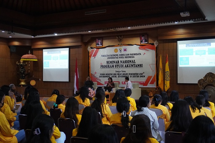 Seminar Nasional Akuntansi diikuti oleh lebih dari tujuh puluh mahasiswa Universitas Hindu Indonesia, dengan narasumber Fungsional Penyuluh Pajak Kanwil DJP Bali, Putu Adi Bayu Suteja Sastra, Kepala Direktorat Litbang, BPK RI dan Anggota Dewan Pembina Nasional IAI, DR. Selvia Vivi Devianti, SE, AK., MSc., MCP, dan Dosen Fakultas Ekonomi Bisnis, dan Pariwisata Universitas dan Kepala Divisi Litbang Lembaga Penelitian dan Pengabdian Masyarakat UNHI Denpasar, Dr. Cokorda Gde Bayu Putra, S.E.,M.Si, CMA., sebagai moderator yang memandu kegiatan Seminar Nasional Akuntansi.