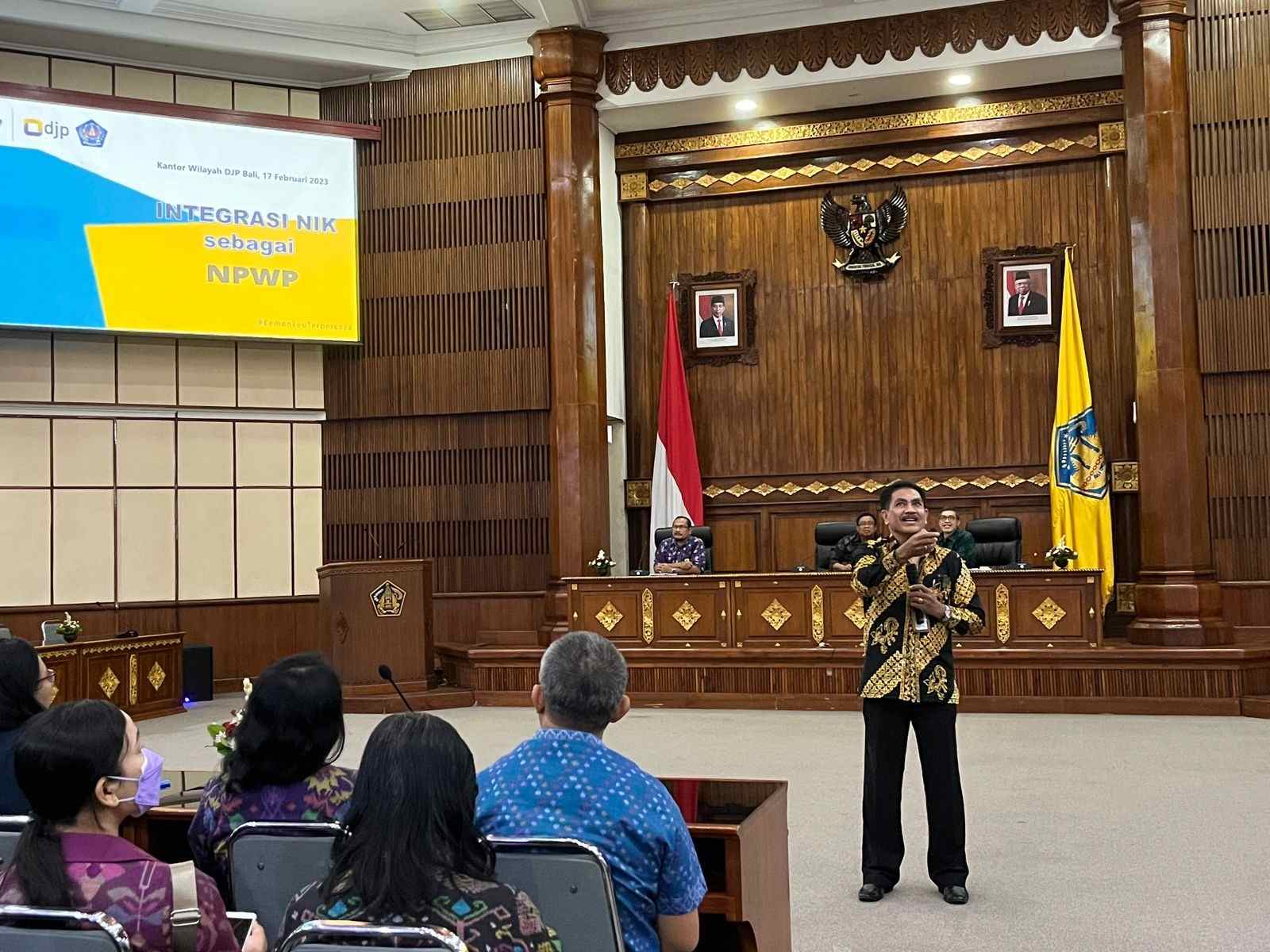 Kantor Wilayah Direktorat Jenderal Pajak (Kanwil DJP) Bali bekerja sama dengan Kantor Pelayanan Pajak (KPP) Pratama Denpasar Timur dan KPP Pratama Denpasar Barat melaksanakan kegiatan sosialisasi pelaporan Surat Pemberitahuan (SPT) Tahunan dan pemadanan Nomor Induk Kependudukan (NIK) menjadi Nomor Pokok Wajib Pajak (NPWP) di Ruang Wisma Sabha Kantor Gubernur Bali, Denpasar (Jumat, 17/2).