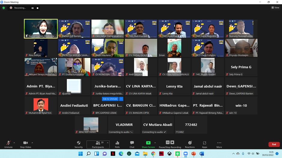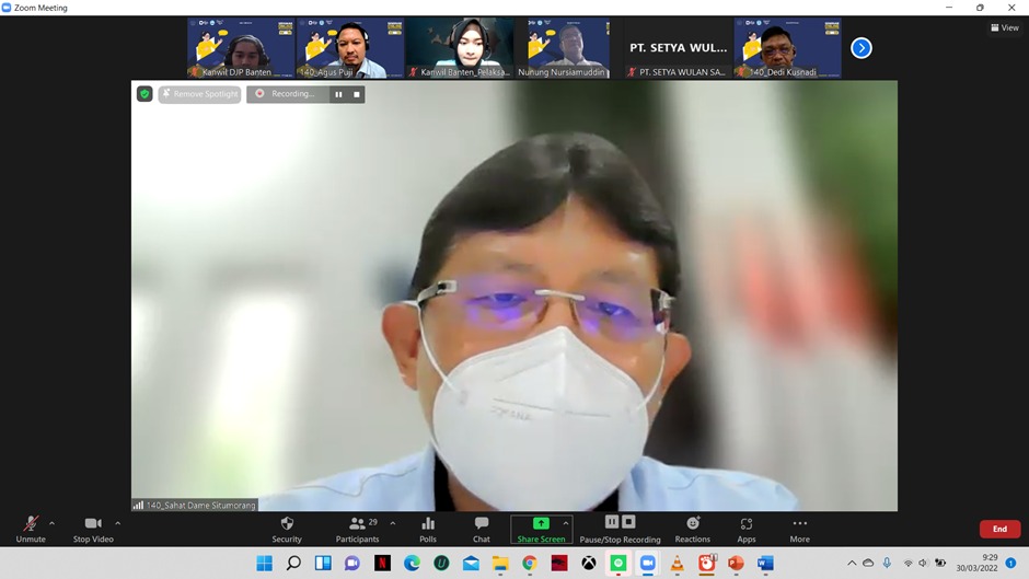 Kantor Wilayah (Kanwil) Direktorat Jenderal Pajak (DJP) Banten kembali mengadakan sosialisasi Undang-Undang Harmonisasi Peraturan Perpajakan (UU HPP) dan Program Pengungkapan Sukarela (PPS) kepada para anggota Gabungan Pelaksana Konstruksi (Gapensi) Banten secara daring melalui aplikasi Zoom Cloud Meeting di Kota Serang, Banten (Rabu, 30/3).