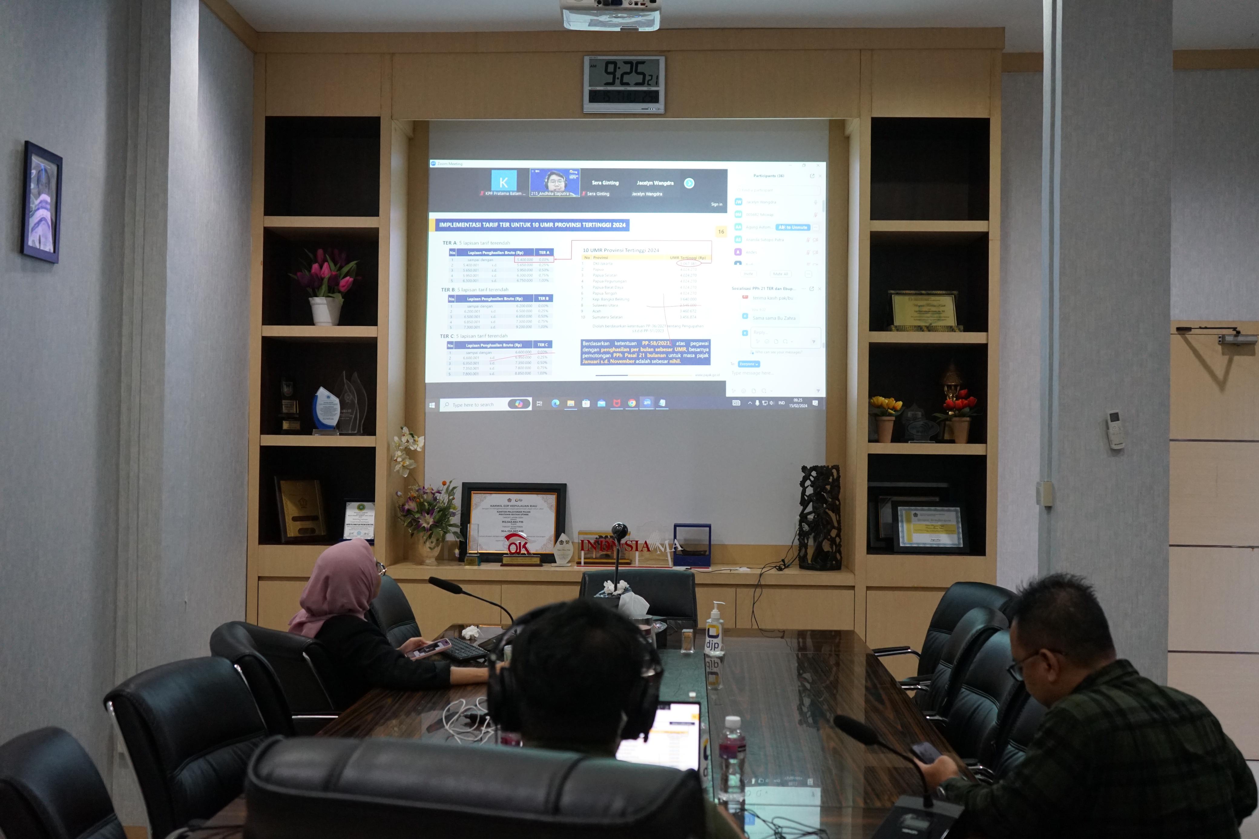 Kantor Pelayanan Pajak (KPP) Pratama Batam Utara menggelar edukasi penghitungan Pajak Penghasilan (PPh) Pasal 21 Tarif Efetif Rata-Rata (TER) dan penggunaan aplikasi e-bupot 21/26 secara daring di Kota Batam, Kepulauan Riau (Kamis, 15/2). Edukasi kali ini dipandu oleh Penyuluh Pajak Merita Katrina Sari sebagai moderator dan Penyuluh Pajak Andhika Saputra sebagai pemateri, dan dihadiri 30 wajib pajak (WP) baik WP Badan maupun Orang Pribadi.
