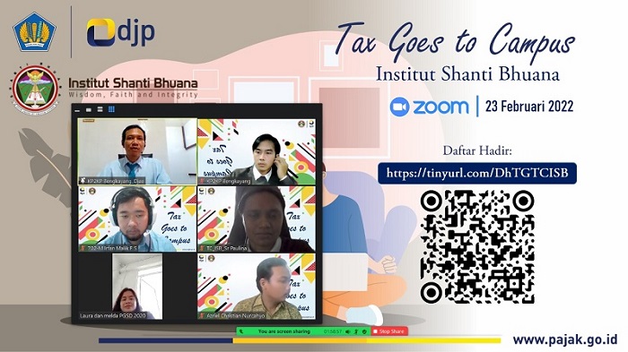 Kantor Pelayanan, Penyuluhan dan Konsultasi Perpajakan (KP2KP) Bengkayang melaksanakan Tax Goes To Campus (TGTC) di Institut Shanti Bhuana secara daring melalui aplikasi zoom meeting, Bengkayang, Kalimantan Barat (Rabu, 23/2).