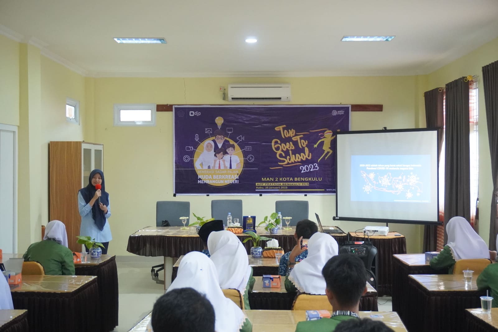 Di MTsN 1 Kota Bengkulu, materi pengenalan perpajakan disampaikan oleh Priska Inggraina, pelaksana Seksi Subbagian Umum dan Kepatuhan Internal. Sedangkan pemateri di MAN 2 Kota Bengkulu adalah Afifah Nadhilah, pelaksana Seksi Pelayanan.