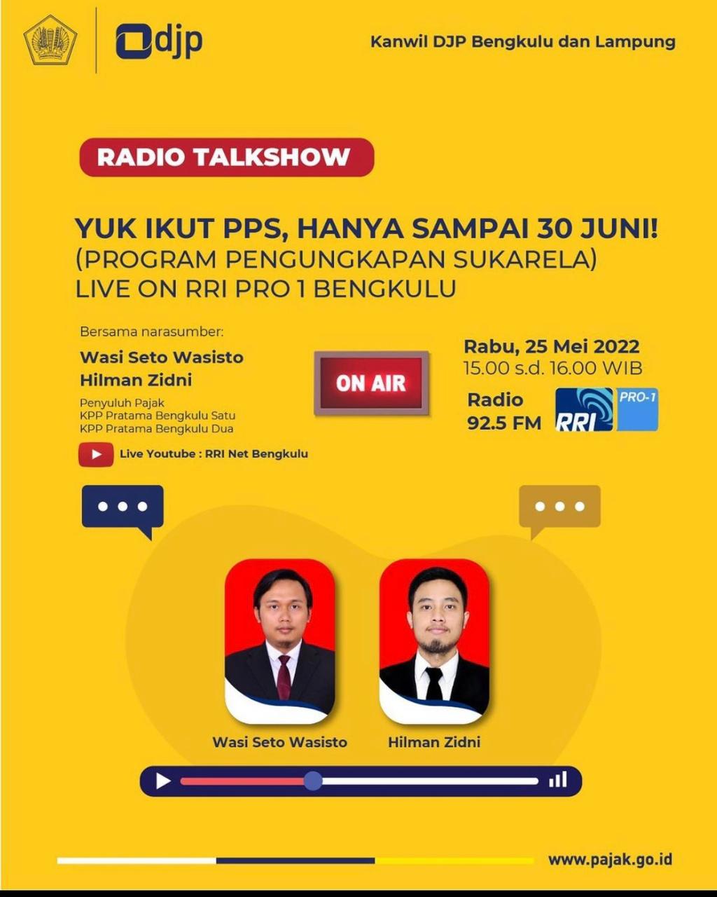 Kantor Pelayanan Pajak (KPP) Pratama Bengkulu Satu bersama KPP Pratama Bengkulu Dua bersinergi untuk menyelenggarakan sosialisasi Program Pengungkapan Sukarela (PPS) melalui siaran langsung gelar wicara di Radio Republik Indonesia Bengkulu di Kecamatan Ratu Samban, Kota Bengkulu (Rabu, 25/5).