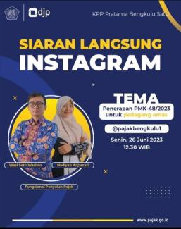 Siaran langsung tersebut dilakukan pukul 12.30 WIB oleh Asisten Fungsional Penyuluh Pajak KPP Pratama Bengkulu Satu, Wasi Seto Wasisto dan Nadiyah Anjarsari. Pemerintah telah menerbitkan Peraturan Keuangan (PMK) Nomor 48 Tahun 2023 dan diundangkan pada 28 April 2023.