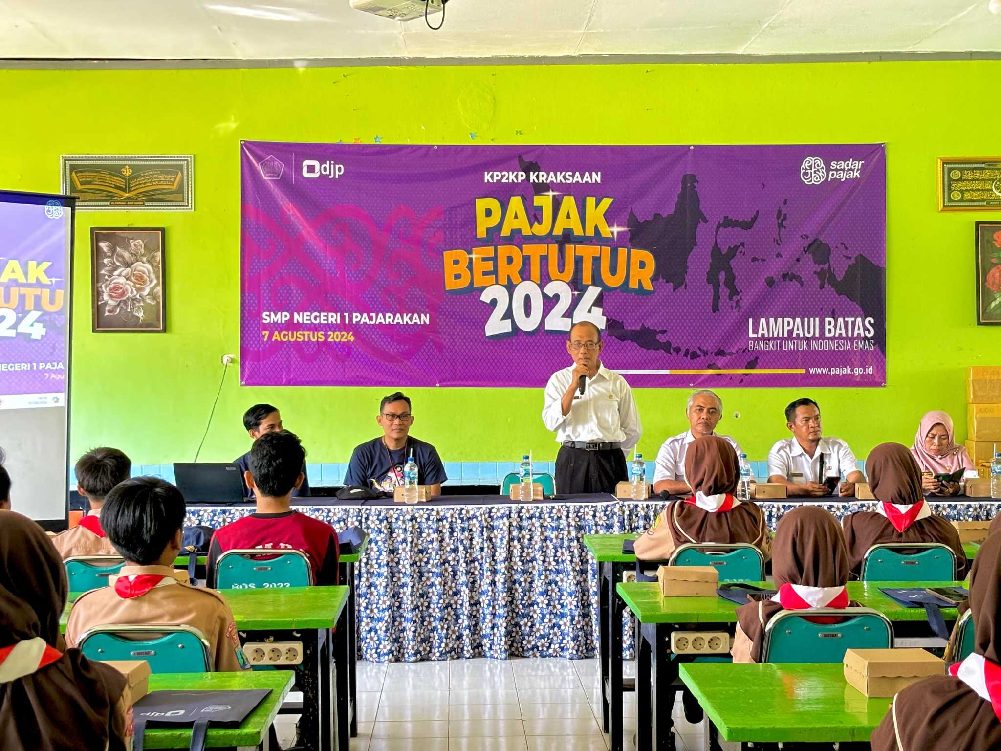 Kantor Pelayanan, Penyuluhan dan Konsultasi Perpajakan (KP2KP) Kraksaan mengadakan kegiatan Pajak Bertutur di Sekolah Menengah Pertama Negeri (SMPN) 1 Pajarakan (Rabu, 7/8). Kegiatan ini merupakan bagian dari agenda tahunan Direktorat Jenderal Pajak (DJP) yang dilakukan serentak di seluruh Indonesia. Pajak Bertutur bertujuan untuk mengkampanyekan inklusi kesadaran pajak di dunia pendidikan, ditujukan bagi pelajar mulai dari tingkat Sekolah Dasar (SD) hingga Perguruan Tinggi (PT).