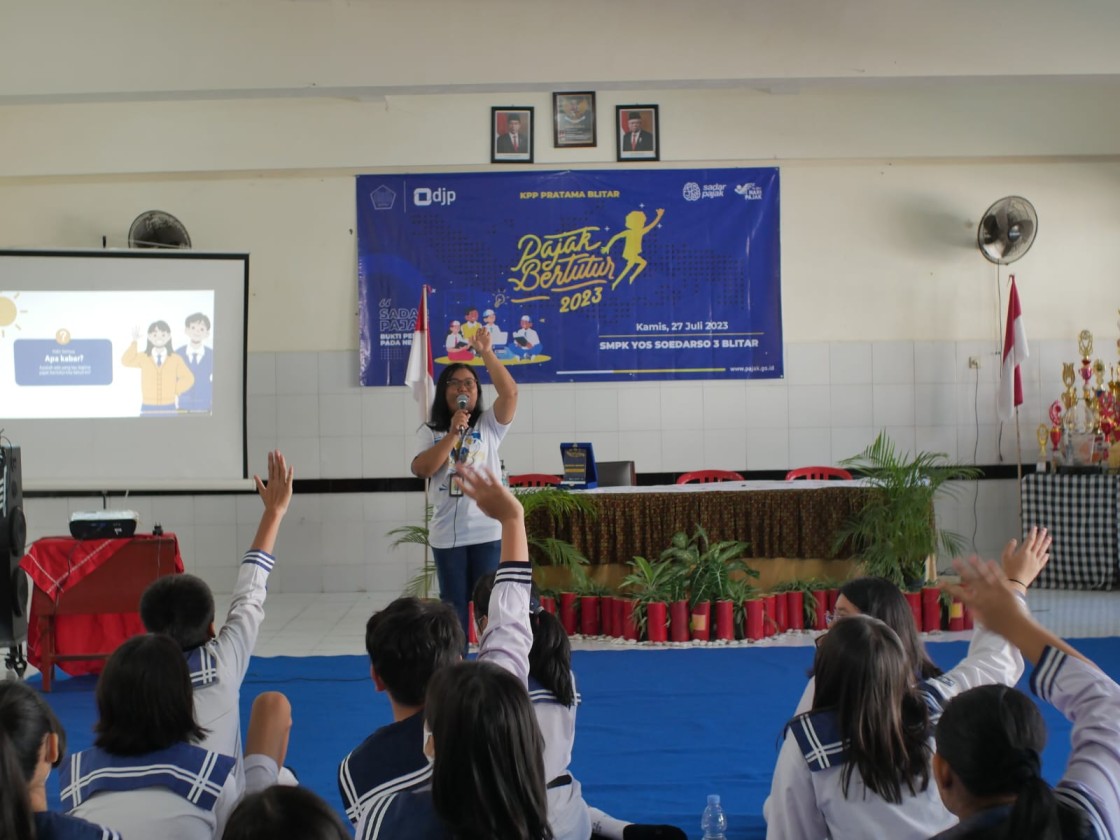 Tim penyuluh Kantor Pelayanan Pajak (KPP) Pratama Blitar mengenalkan pajak kepada 30 siswa Sekolah Menengah Pertama (SMP) Katolik Yos Soedarso 3 Blitar melalui berbagai permainan dalam acara Pajak Bertutur (Jumat, 27/7).