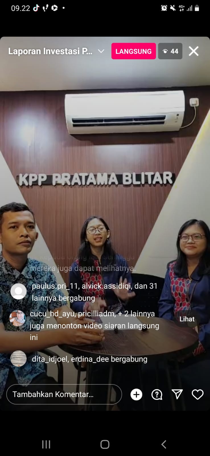 Kantor Pelayanan Pajak (KPP) Pratama Blitar mengadakan sosialisasi perpajakan dengan mengusung tema Kewajiban Wajib Pajak Peserta Program Pengungkapan Sukarela (PPS) Pasca Pelaksanaan PPS yang berakhir pada 30 Juni Tahun 2022 melalui Live Instagram akun @pajakblitar di Kota Blitar (Jumat, 26/5). Acara berlangsung selama 30 menit dan diikuti oleh 47 peserta.