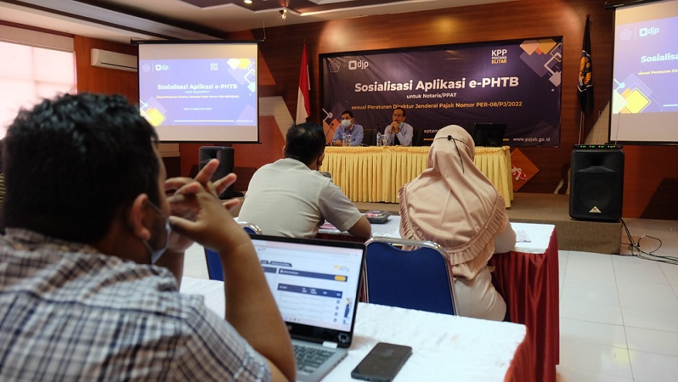 Kantor Pelayanan Pajak (KPP) Pratama Blitar gelar sosialisasi aplikasi e-PHTB di Ruang Aula KPP Pratama Blitar (Rabu, 7/9). Kegiatan ini dihadiri oleh 37 peserta yang merupakan notaris, Pejabat Pembuat Akta Tanah (PPAT) dan perwakilan dari Badan Pertanahan Nasional, Badan Pendapatan Daerah, serta Badan Pengelolaan Keuangan dan Aset Daerah di wilayah kota dan Kabupaten Blitar.